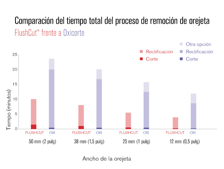 Elegir el proceso Hypertherm® FlushCut proporciona una alternativa más rápida, limpia y precisa a los métodos tradicionales como el oxicorte y el ranurado por arco de carbono. A diferencia del oxicorte, que tiene dificultades con los metales no ferrosos y deja escoria difícil de eliminar, el plasma ofrece cortes suaves y uniformes en un amplio rango de materiales y tiene hasta 10 veces menos zonas afectadas por el calor (ZAT). En comparación con el arco de carbono, el corte al ras con plasma produce una cantidad mínima de escoria y residuos, lo que reduce la necesidad de rectificación. Con la capacidad de cortar más cerca del metal base y luego eliminar el metal residual mediante lavado con plasma, FlushCut reduce la necesidad de realizar tareas de esmerilado que consumen tiempo y requieren mucha mano de obra, ayudando así a los fabricantes a mejorar la productividad y reducir los costos.