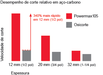 - Conclua os trabalhos mais rápido com velocidades de corte três vezes maiores do que o oxicorte em aço-carbono de 12 mm (1/2 pol)