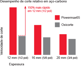 - Conclua os trabalhos mais rápido, com velocidades de corte uma vez e meia maiores do que o oxicorte em aço-carbono de 12 mm (1/2 pol)
