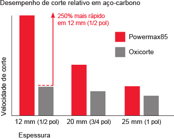 • Conclua os trabalhos mais rápido, com velocidades de corte duas vezes e meia maior do que o oxicorte em aço-carbono de 12 mm (1/2 pol)